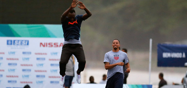 بولت (يسار) يستعرض قدراته قبل سباق ثنائي مع الأميركي سبيرمان في البرازيل. أ.ف.ب