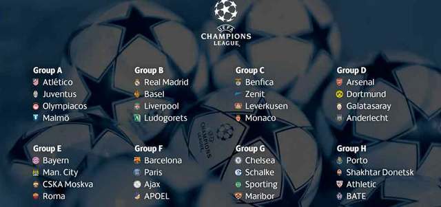 أما في الثالثة فهناك بنفيكا، وزينيت الروسي، وليفركوزن الألماني وموناكو الفرنسي. وفي الرابعة أرسنال الإنجليزي، وبوروسيا دورتموند الألماني، وغلطة سراي التركي، واندرلخت البلجيكي. وضمت الخامسة بايرن، ومانشستر سيتي، وسسكا موسكو الروسي وروما الإيطالي. وجاءت مجموعة برشلونة الإسباني ضعيفة، فقد ضمت سان جرمان، واياكس، وابويل القبرصي. ولن يجد ممثل إنجلترا تشلسي صعوبة في تجاوز السابعة التي تضم