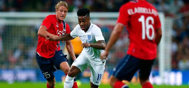 استرلينغ يحاول تجاوز دفاع النرويج. أ.ف.ب