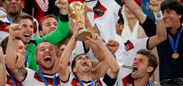 قائد المنتخب الألماني لام يرفع كأس العالم 2014. أ.ف.ب