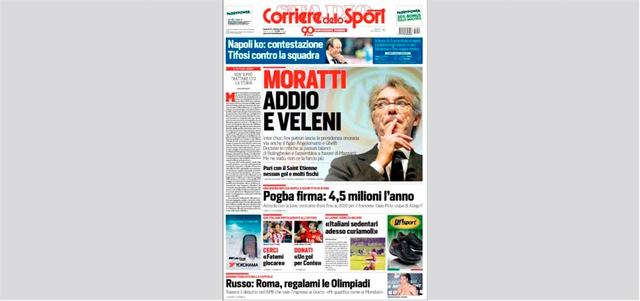 خصّصت الصحف الإيطالية مساحة واسعة للحديث عن استقالة موراتي من الرئاسة الفخرية لإنترميلان، بعد أن أمضى 20 سنة متواصلة، قاد فيها الإنتر كرئيس مباشر لـ18 سنة. ويذكر أنه فوت أغلبية أسهم النادي إلى الإندونيسي توهير. وذكرت «كوريرا ديلو سبورت» ان ابن موراتي أيضاً استقال، والأمر نفسه بالنسبة للأعضاء المحسوبين على الرئيس موراتي، استقالوا من مناصبهم، لكن موراتي لايزال يمتلك نحو ربع أسهم النادي.