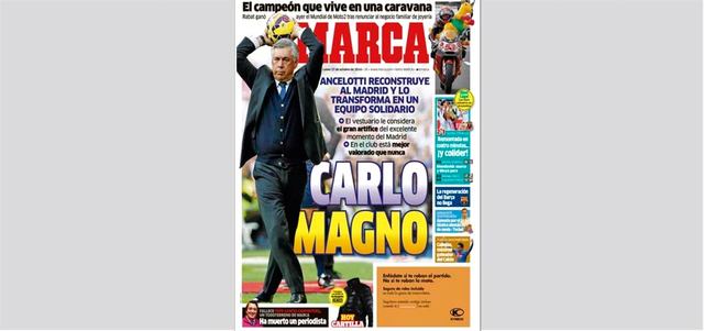 أغدقت الصحف المدريدية في الثناء على المدرب الإيطالي كارلو أنشيلوتي، بعد أن قاد ريال مدريد إلى فوز ثمين على برشلونة 3-1 في الدوري الإسباني، وقالت صحيفة «ماركا» تحت عنوان «كارلو المتفتح»، إن «أنشيلوتي أعاد بناء ريال مدريد، وحوله إلى فريق أكثر تماسكاً وأكثر نضجاً فنياً دفاعاً وهجوماً».