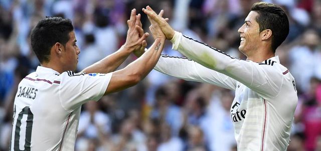 رودريغيز يحتفل بالفوز على برشلونة مع رونالدو. أ.ف.ب