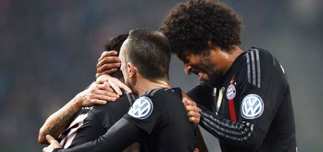 فرحة لاعبي البايرن بعد الفوز على هامبورغ أول من أمس في الكأس. أ.ف.ب