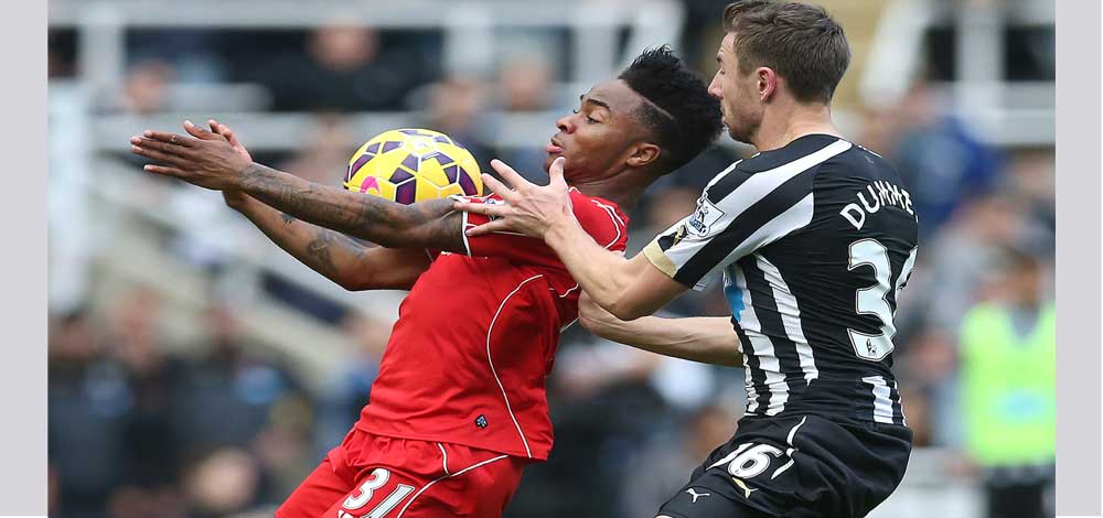 لاعب ليفربول رحيم ستيرلينغ في صراع على الكرة مع مدافع نيوكاسل يونايتد في المباراة التي انتهت لصالح الأخير بهدف دون رد - أ ف ب