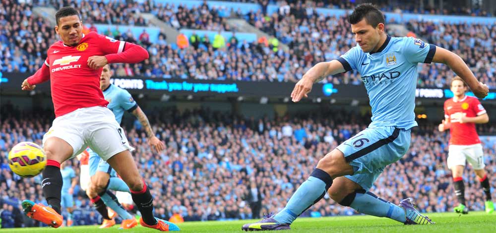 لاعب مان يونايتيد "كريس سمالينغ" يحاول منع لاعب السيتي "سيرجيو أوغويرو" من التسجيل - أ ف ب