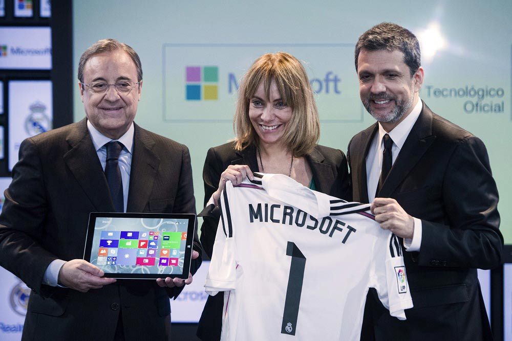 رئيس نادي ريال مدريد فلورينتينو بيريز ورئيسة فرع مايكروسوفت في أسبانيا ماريا غارانا ومدير التطوير في فرع الشركة بأسبانيا أورلاندو آيالا يعرضان التطبيق الجديد وقميص النادي الملكي مع اسم الشركة الأميركية والرقم واحد. إي بي ايه