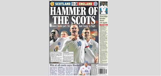 فتحت صحف إنجلترا، أمس، صفحاتها الأُوَل للاحتفاء بواين روني، بعد أن سجل هدف الفوز على اسكتلندا في اللقاء الودي الذي جمع المنتخبين، اول من امس. وقالت صحيفة «ديلي إكسبريس» إن روني أظهر مهارة استثنائية، وقام بجهد كبير جداً في المواجهة الخاصة أمام أسكتلندا، باعتبار العلاقات التاريخية والجوار والسياسة التي تربط البلدين.