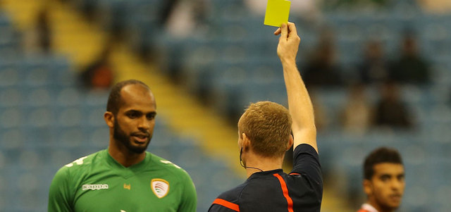الحكم البولندي بورسكي يوجه إنذاراً لحارس عُمان علي الحبسي في مباراة قطر. تصوير: إريك أرازاس