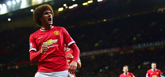 مروان فيلايني يحتفل بعد تسجيله الهدف الأول لمانشستر على ستوك سيتي. أ.ف.ب