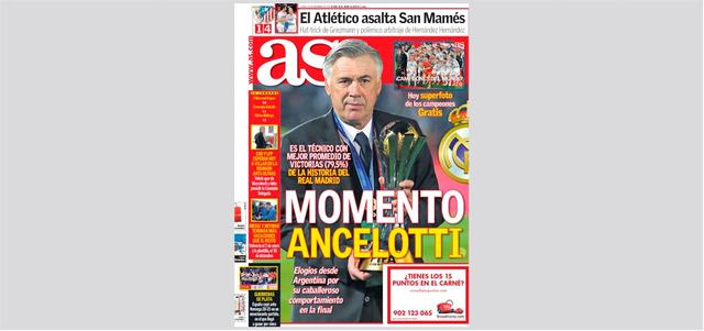نشرت صحيفة «أس» الإسبانية، ذات الميول المدريدي، أمس، صورة رئيسة على غلافها للمدرب الإيطالي كارلو أنشيلوتي، وتحدثت عن المدرب الكبير بعدما قاد الفريق الملكي للفوز بلقب كأس العالم للأندية على حساب سان لورينزو الأرجنتيني بهدفين. وعنونت غلافها: «لحظة أنشيلوتي»، وقالت إن «هذا الوقت هو وقته، نظراً للإنجازات والأرقام التي يحققها مع ريال مدريد محلياً ودولياً وعالمياً». وأضافت «أنشيلوتي يحقق أعلى نسبة فوز كمدرب في تاريخ الملكي 79.5%».