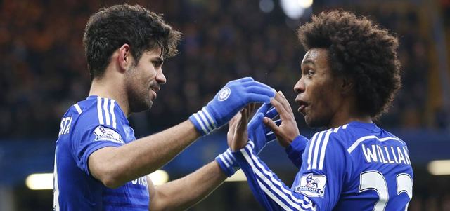 كوستا يحتفل مع ويلان بهدفه مع تشلسي في شباك وست هام. أ.ف.ب
