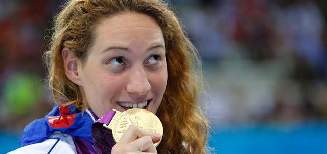 كامي قضت خلال تصوير برنامج واقع بالأرجنتين.. وفي الصورة تحتفل بذهبية «لندن 2012» في السباحة. أ.ف.ب