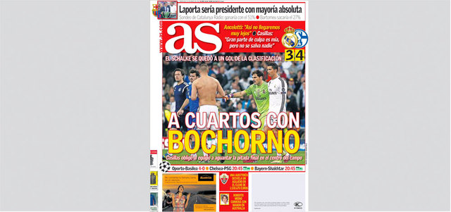 واجه حارس ريال مدريد ايكر كاسياس، ومعه عدد كبير من لاعبي ريال مدريد اول من أمس، غضباً جماهيرياً كبيراً بعد أن كان قاب قوسين أو ادنى من الخروج مبكراً من دوري الأبطال الذي يحمل لقبه على يد شالكه في معقله ببرنابيو، حيث لم يكن يفصل بينه وبين هذا الاقصاء إلا هدف واحد عجز الألمان عن تسجيله. وقال كاسياس: «اتحمل كامل المسؤولية، ما حصل أمر لا يبرر، لكن الكل ليس معفى من المسؤولية ايضاً»، في حين رأى مدرب الفرق أنشيلوتي انهم «لن يذهبوا بعيداً بهذا المستوى السيئ». «أس»
