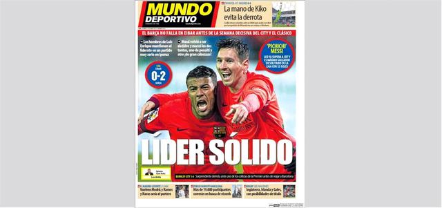 عنونت صحيفة «موندو ديبورتيفو» الكاتالونية غلافها أمس: «المتصدر الكبير» بعد فوز برشلونة على إيبار المتواضع بهدفي النجم الأرجنتيني ليونيل ميسي في الدوري الإسباني، وقال الصحيفة إن «ميسي الحاسم يسجل ثنائية واحد من ركلة جزاء والثاني بالرأس.. نجوم انريكيه يواصلون الانتصارات». واهتمت الصحيفة بنبأ خسارة مانشستر سيتي أمام بيرنلي في إنجلترا قبل أيام من لقائه في دوري الأبطال.