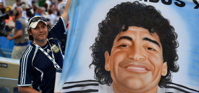 مشجع أرجنتيني يرفع صورة الأسطورة مارادونا في «الماراكانا». أ.ف.ب