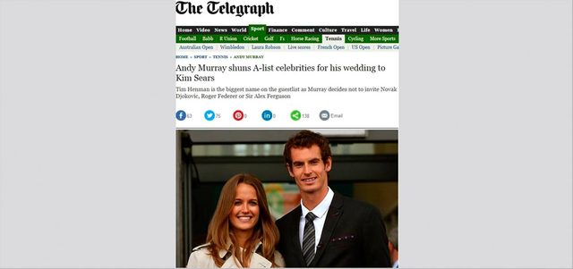 تحول زفاف نجم التنس البريطاني أندي موراي إلى مادة صحافية دسمة هذه الأيام، فبعد أن تقرر موعد قرانه بالحسناء كيم سيرز، بات التركيز على قائمة الحضور، حيث تبين أن أبرز خصومه حالياً في الملاعب الصفراء لن يحضروا، منهم السويسري فيدرر، والصربي ديوكوفيتش، وحتى أقرب أصدقائه الإسباني رافايل نادال لن يستطيع الحضور، في حين سيكون حاضراً النجم السابق تيم هينمان، والمدرب التاريخي لمان يونايتد، ألكس فيرغسون، وأبرز أصدقاء اللاعب وأقاربه. «تيليغراف»
