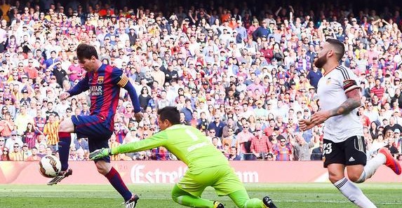 هز ليونيل ميسي الشباك لبرشلونة المتصدر للمرة 400 بهدف في الوقت القاتل ليقوده للفوز 2-صفر على بلنسية الذي أضاع سيلا من الفرص في مباراة ممتعة بدوري الدرجة الأولى الإسباني لكرة القدم أمس، بينما واصل ريال مدريد مطاردته لغريمه بتغلبه على ملقة 3-1.