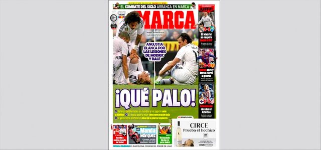 خيّم الحزن على الصحف الموالية لنادي ريال مدريد، بعد الإصابة التي تعرض لها النجمان غاريث بيل ولوكا مودريتش، خلال مباراة ملقة في الدوري الإسباني. وعنونت صحيفة ماركا غلافها أمس: «قلق في القلعة البيضاء بعد اصابة كل من مودريتش وبيل.. غادرا البيرنابيو بالعكازات، ولن يشاركا أمام الأتليتيكو.. الكرواتي قد تصل فترة غيابه لخمسة أسابيع، والويلزي مصاب في الساق اليسرى». دبي ـــ الإمارات اليوم