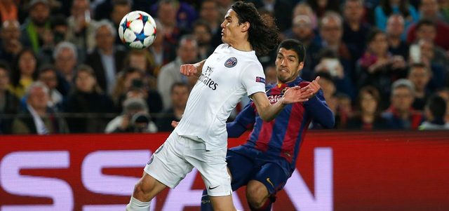 كافاني في حوار مع مواطنه سواريز خلال لقاء سان جرمان وبرشلونة الأخير. أ.ب