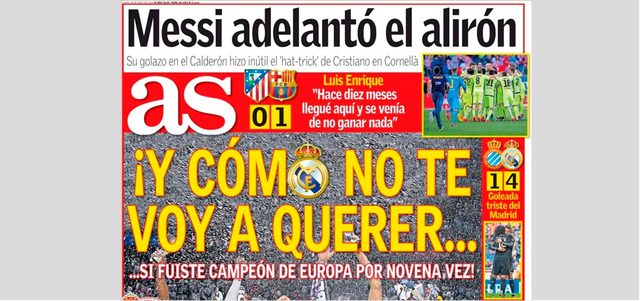 تعاملت الصحف الموالية لنادي ريال مدريد بواقعية مع فوز برشلونة بلقب الدوري الإسباني، عشية انتصاره على مضيفه أتلتيكو مدريد، بهدف نظيف أحرزه ميسي. وعنونت «ماركا» غلافها أمس: «دوري ميسي»، وقالت: «هدف رائع من ميسي يفتح الطريق نحو الثلاثية.. برشلونة يؤكد الفوز باللقب رقم 23». أما «أس» فعنونت غلافها: «ميسي يجلب الأفراح»، وقالت «هدفه في الكالديرون يجعل من هاتريك رونالدو في إسبانيول لا هدف منه».