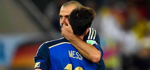 ماسكيرانو مع ميسي بعد خسارة لقب كأس العالم في البرازيل. أ.ف.ب