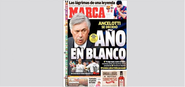 تساءلت الصحف الإسبانية عن مصير المدرب الإيطالي، ماركو أنشيلوتي، مع نادي ريال مدريد، وعنونت صحيفة «ماركا» غلافها أمس: «تحديد مصير الإيطالي»، وأضافت على لسان المدرب نفسه: «أنشيلوتي: عام آخر مع مدريد أو إجازة لمدة سنة»، وأوضحت «رونالدو يدعم بقاء المدرب في رسالة لفلورنتينو بيريز»، وكتبت الصحيفة أيضاً: «كريستيانو يضمن الفوز بالحذاء الذهبي بعد تسجيله 48 هدفاً».