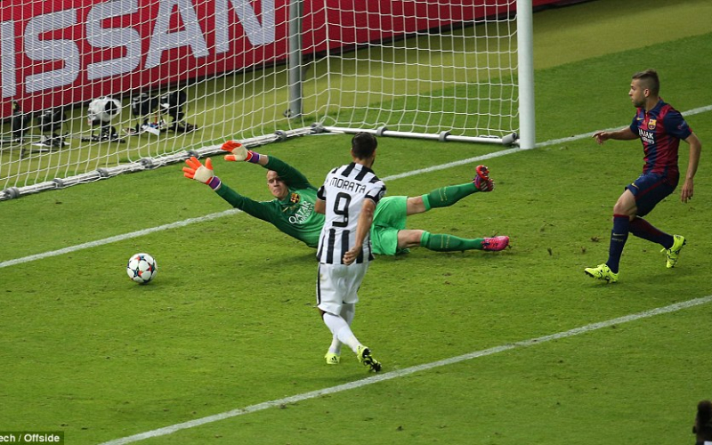 ونجح يوفنتوس في ادراك التعادل بعد هجمة منسقة بدأها ماركيزيو بتمريرة رائعة بالكعب الى ليشتاينر الذي توغل داخل المنطقة ولعبها عرضية زاحفة الى تيفيز الذي استدار حول نفسه وسددها من مسافة قريبة ارتدت تي شتيغن الى موراتا الذي تابعها داخل المرمى الخالي (55).