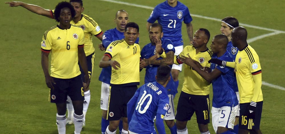 اشتباك بين نيمار ومورييو بعد اعتداء كابتن منتخب البرازيل على اللاعب الكولومبي الذي سجل هدف الفوز لفريقه. أ ف ب