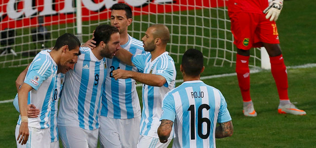 لاعبو الأرجنتين يحتفلون بهدف هيغواين اليتيم في شباك جامايكا. رويترز