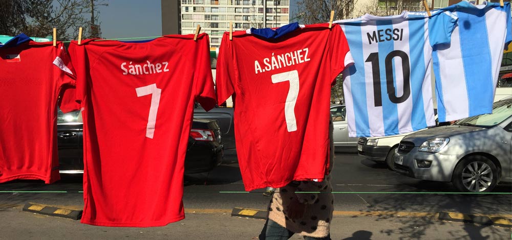 قمصان تحمل رقمي أشهر لاعبين في تشيلي والأرجنتين (سانشيز وميسي) تباع في شوارع سانتياغو قبل المباراة النهائية. أ ف ب