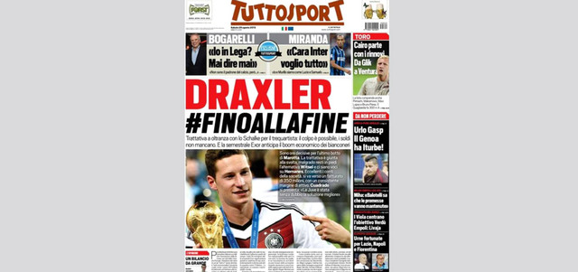 وافق نادي شالكه الألماني لكرة القدم على بيع لاعبه جوليان دراكسلر إلى يوفنتوس الإيطالي مقابل 26 مليون يورو، لتكون آخر صفقات اليوفي قبل غلق سوق الانتقالات. يذكر أن اليوفي هزم العديد من الأندية الأخرى في صفقة دراكسلر الذي كان مطلوباً بشدة في الدوري الإيطالي، ودوريات أوروبية أخرى، بالنظر إلى القدرات التي تتوافر لدى اللاعب، لكن إصرار اليوفي حسم الأمر في النهاية. ويراهن مدرب اليوفي اليغري كثيراً على الوافد الجديد من أجل تعزيز خط الهجوم للفريق.