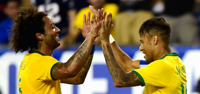 مارسيلو ونيمار يحتفلان بالفوز 4-1 على أميركا. أ.ف.ب