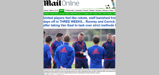 زاد التوتر بين لاعبي مانشستر يونايتد ومدربهم الهولندي لويس فان غال، بسبب أسلوبه وقواعده التي تشبه العسكرية في التعامل مع لاعبيه، فلم يعد الأمر يقتصر على المشكلة التي حصلت بينه وبين الحارس الإسباني فيكتور فالديس، الذي لايزال متمرداً على مدربه، ويرفض اللعب لفريق الرديف، بل تعدى الأمر إلى لاعبين آخرين باتوا يشعرون كأنهم «روبوت»، حيث يمنع عليهم الإجازات، والأكل مع موظفي النادي، والحديث إليهم، ويلزمهم بتدريبات صارمة، قائلين إن أسلوب فان غال سيدمر عائلة الفريق.