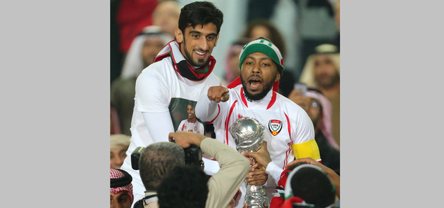 إسماعيل مطر وحمدان الكمالي يحملان كأس الخليج. تصوير: أسامة أبوغانم