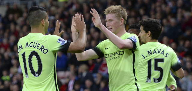 أغويرو يحتفل مع دي بروين بفوز سيتي. أ.ف.ب