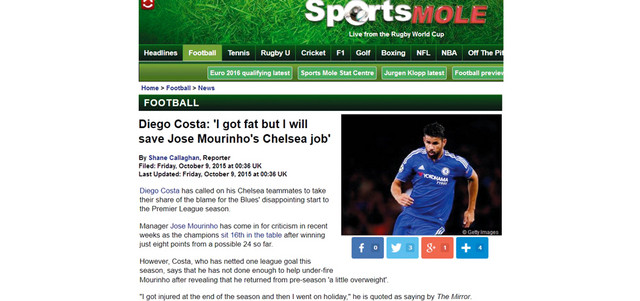 اعترف مهاجم تشلسي، الاسباني البرازيلي الاصل دييغو كوستا انه عاد من إجازة الصيف بوزن زائد مقارنة بما كان عليه خلال الموسم الماضي، وهو الامر الذي ساهم في تواضه مستوى هجوم تشلسي خلال الفترة الماضي، حيث لم يجمع سوى ثماني نقاط في الدوري الانجليزي الممتاز، ويقبع في المركز الـ16، في حين سجل كوستا هدفا واحدا فقط، وتعرض لانتقادات شديدة من قبل مدربه مورينيو بسبب سمنته وكذلك لسوء سلوكه داخل الملعب.