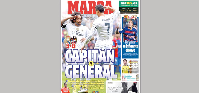 عنونت صحيفة «ماركا» الإسبانية غلافها أمس: «القائد واللواء»، ونشرت صورة لكابتن ريال مدريد البرازيلي مارسيلو والهداف البرتغالي كريستيانو رونالدو يؤديان التحية العسكرية، بعد الفوز على ليفانتي في الدوري الإسباني لكرة القدم بثلاثية نظيفة. وكتبت الصحيفة «مارسيلو يوضح المباراة ويحسمها.. نافاس نجم مرة أخرى من دون منازع ورونالدو وخيسي يسجلان».