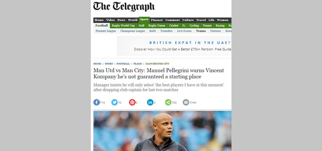 قال مدرب مانشستر سيتي، التشيلي مانويل بيليغريني، إنه لا يقدم أي ضمانة لمدافع الفريق، البلجيكي فانسانت كومباني لكي يلعب اساسياً اليوم في الصدام مع مانشستر يونايتد. وأوضح بيليغريني أنه سيختار افضل اللاعبين الجاهزين فقط. ولعب كومباني بديلاً في آخر مباراتين أمام بورنموث في الدوري، وأشبيلية في الابطال، كما أن اللاعب عانى قبل ذلك إصابة أبعدته نحو شهر عن الملاعب.