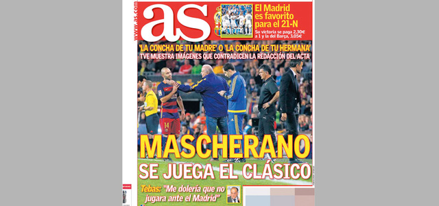 وعنونت صحيفة «أس» غلافها أمس: «تصرف ماسكيرانو لم يكن الأول»، وأوضحت أنه «سبق للأوروغوياني داميان سواريز لاعب فريق التشي السابق، وخيتافي الحالي، تصرف مماثل أثناء مباراة التشي وفريق (برشلونة ب) في 2013».