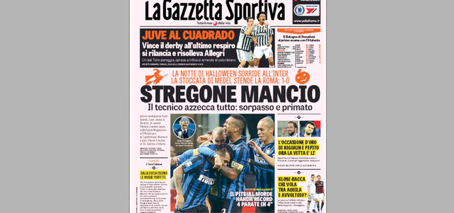 سلطت الصحف الإيطالية الصادرة أمس، الضوء على فوز إنتر ميلان على روما بهدف نظيف في قمة الجولة الـ 11 من الدوري الإيطالي، وعنونت «لاغازيتا ديلو سبورت» غلافها: «مانشيني.. الطبيب الساحر»، وأضافت أن «المدرب قام بكل شيء صحيح.. فوز وصدارة.. الإنتر مبتسم بهدف ميديل والحارس هاندانفيتش ينقذ إنتر من أربعة أهداف».