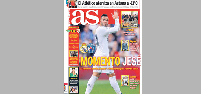 عنونت صحيفة «أس» الإسبانية غلافها أمس: «لحظة خيسي»، في إشارة إلى تألق النجم الإسباني في المباريات الأخيرة لريال مدريد، آملة أن يضع اللاعب بصمته في مباراة اليوم أمام باريس سان جرمان الفرنسي. وقالت الصحيفة إن «الكناري خيسي يقدم أداء رائعاً في هذه الفترة، ويعتمد عليه المدرب رافائيل بينيتيز بشكل كبير لكي يعوض غياب بنزيمة». دبي ـــ الإمارات اليوم