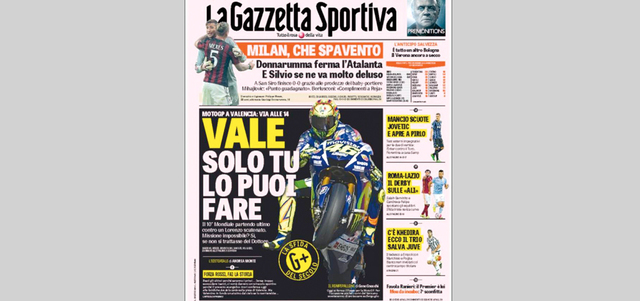 عنونت صحيفة «لاغازيتا ديلو سبورت» الإيطالية غلافها أمس: «الميلان.. يا له من خوف»، بعد أن تعادل الفريق اللومباردي مع أتلانتا في الدوري الإيطالي لكرة القدم، وقالت الصحيفة إن «دوناروما يوقف اتالانتا»، بعد أن تألق الحارس وتصدى للعديد من الكرات وأسهم في خروج فريقه بنقطة أمام خصمه القوي، وتغنى المدرب ميهالوفيتش بدوناروما المبدع.