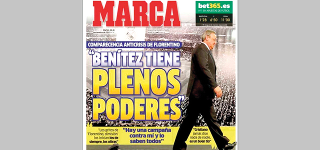 وجّه رئيس ريال مدريد الإسباني، فلورنتينو بيريز، رسالة دعم قوية إلى مدرب الفريق بينيتيز، قائلاً إن «المدرب يحظى بالثقة الكاملة من إدارة الملكي لتأدية مهامه، وإنه لم يكن يفكر إطلاقاً في إقالته»، كما شدد على أن أمر الإقالة من عدمه هو من اختصاصه ومجلس الإدارة، وليس شأناً خاصاً بوسائل الإعلام. وحذر بيريز من سماهم المتربصين بالفريق من بعض الصحافيين، قائلاً: «إنهم يروّجون الشائعات». «ماركا»