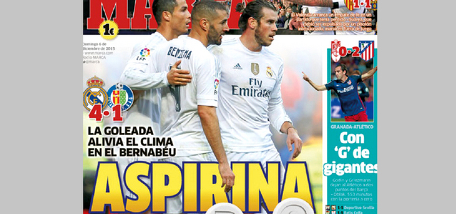 عنونت صحيفة «ماركا» الإسبانية الموالية لنادي ريال مدريد غلافها أمس: «أسبرين بي بي سي»، في إشارة إلى الفوز المهدئ لجمهور النادي الملكي عقب الانتصار على خيتافي 4-1 في «الليغا». وقالت الصحيفة «الفوز يقلل الاحتقان في البرنابيو.. بنزيمة يحرز هدفين وغاريث بيل ورونالدو يسجلان».