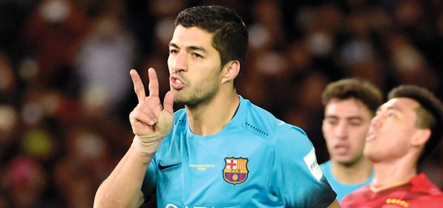 قاد الأوروغوياني، لويس سواريز، برشلونة الإسباني بطل أوروبا إلى تحقيق انطلاقة جيدة في رحلة البحث عن لقبه الثالث في بطولة العالم للأندية في كرة القدم، المقامة حالياً في اليابان، بفوزه الصريح على غوانزهو ايفرغراندي الصيني، بطل آسيا، 3-صفر، أمس، في نصف النهائي. وسجل المهاجم سواريز أهداف الفوز (39 و50 و67 من ركلة جزاء).