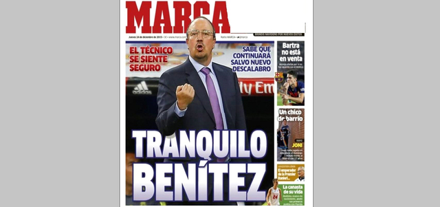 يشعر مدرب ريال مدريد رافا بينيتيز، بالارتياح على الرغم من موجة الأنباء خلال الأيام الماضية التي تصب كلها في اتجاه توصل إدارة النادي الملكي إلى قناعة بضرورة إقالة المدرب والاستعانة بخدمات مدرب آخر قد يكون البرتغالي مورينيو، مدرب الفريق سابقاً، والذي بات متاحاً بعد رحيله عن تشلسي أخيراً. ويشعر بينيتيز بأن رئيس الريال بيريز لا يهتم لكل الاخبار، وأنه يدعمه بقوة.