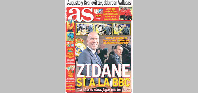 قال زيدان بعد أول حصة تدريبية له مع الريال، أول من أمس، إن خطته بسيطة للغاية، وهي التركيز أكثر على الهجوم، وإنه سيعتمد بشكل كبير على الثلاثي بيل ورونالدو وبنزيمة في المقدمة. وأوضح انه مع منح اللاعبين حرية اللعب من دون تقييدهم كثيراً والضغط عليهم نفسياً، كما أشار إلى أنه يريد من لاعبي الريال الاستمتاع باللعب. وحضر أكثر من 6000 مشجع أول حصة تدريبية لزيدان، حيث يحظى النجم السابق بشعبية كبيرة بين جمهور الملكي.
