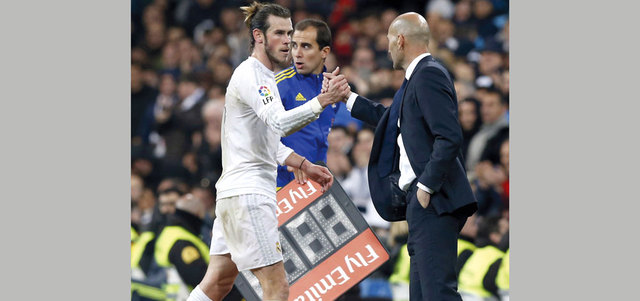 زيدان يصافح غاريث بيل بعد تسجيله «هاتريك». أ.ف.ب