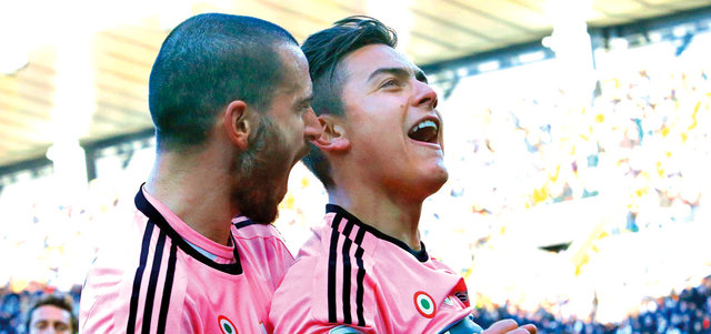ديبالا «يمين» يحتفل مع بونوتشي بفوز سابق لليوفي. أ.ف.ب